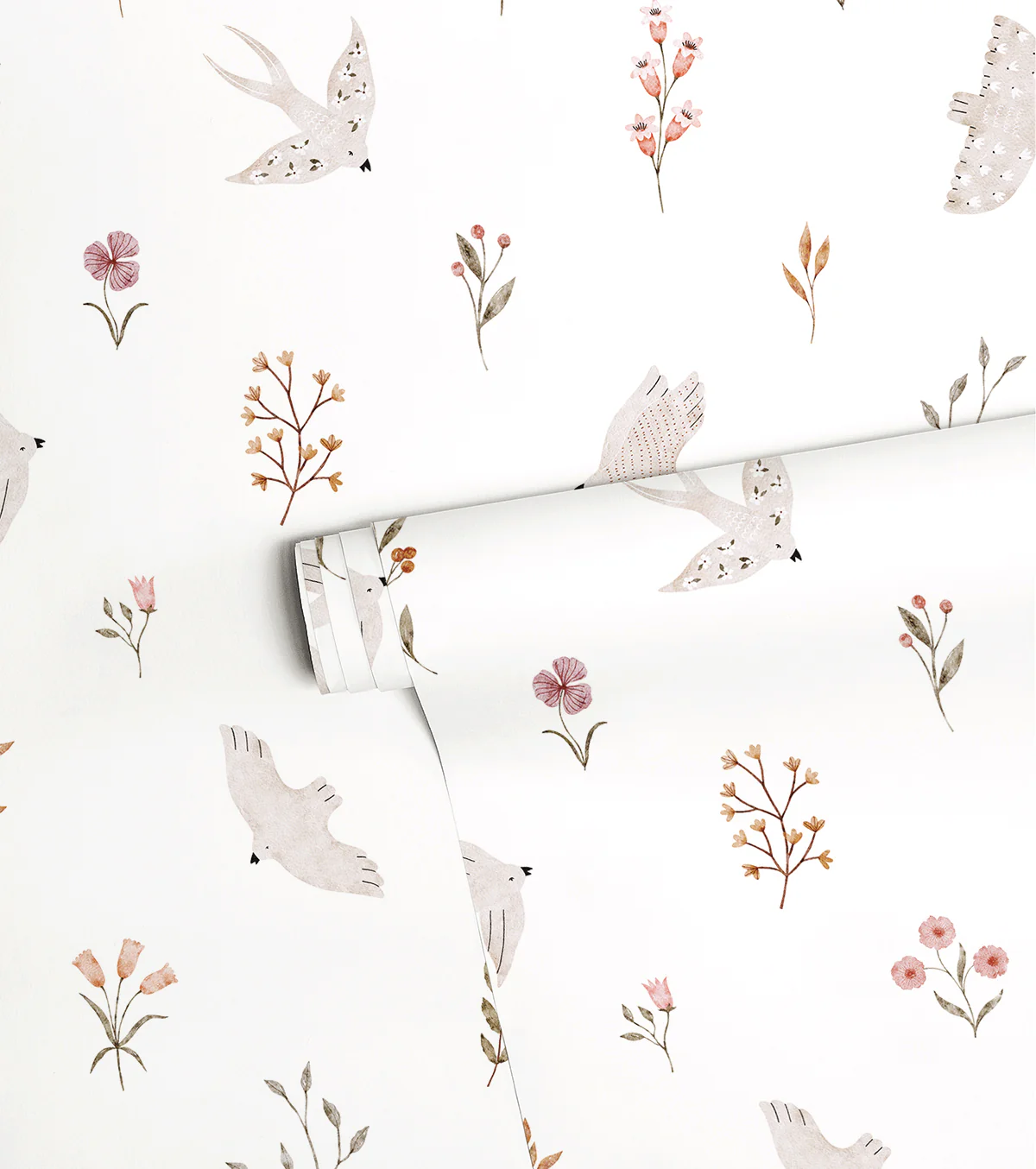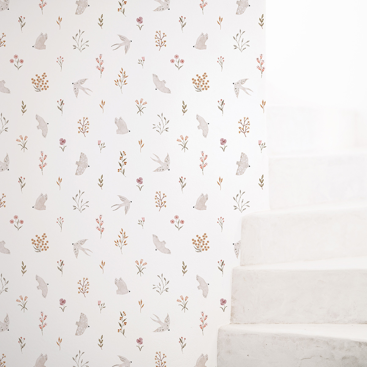 Offrez à la chambre de votre enfant une touche de charme printanier avec le papier peint Coccinella. Ses illustrations de hirondelles et fleurs créent une ambiance douce et rafraîchissante, idéale pour éveiller la curiosité et l’imagination.