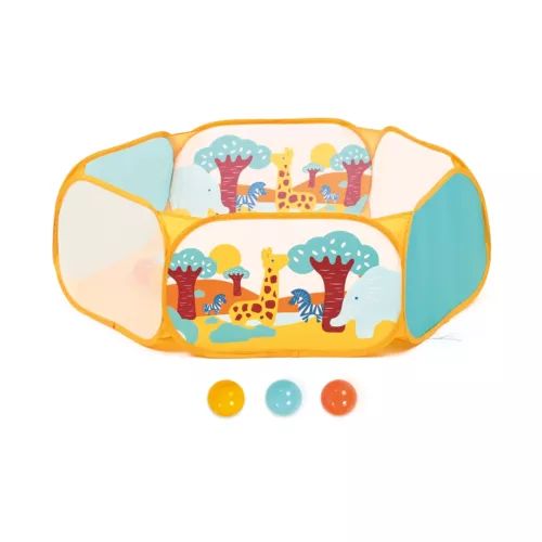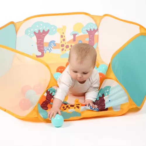 Avec ses parois souples et résistantes, la piscine permet à l’enfant de s’asseoir, ramper et jouer librement. Les balles encouragent la préhension, la coordination et la découverte des couleurs.
