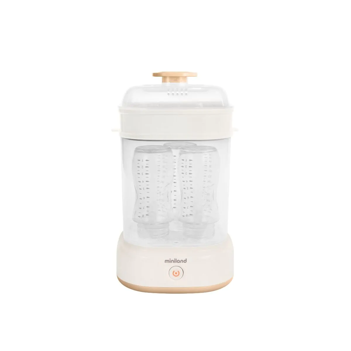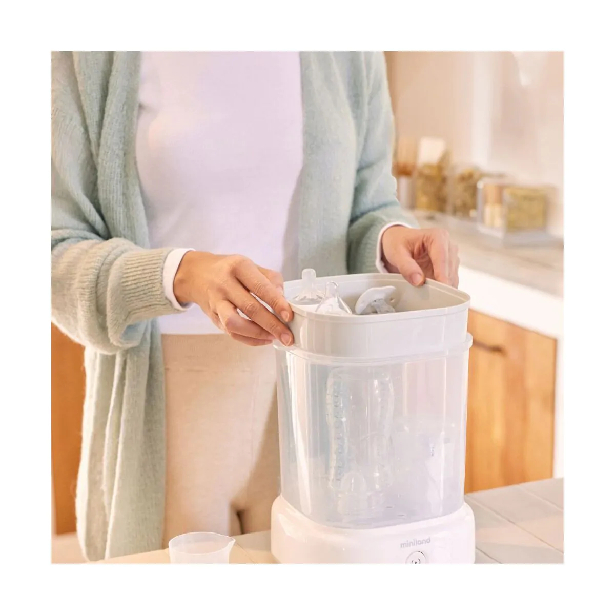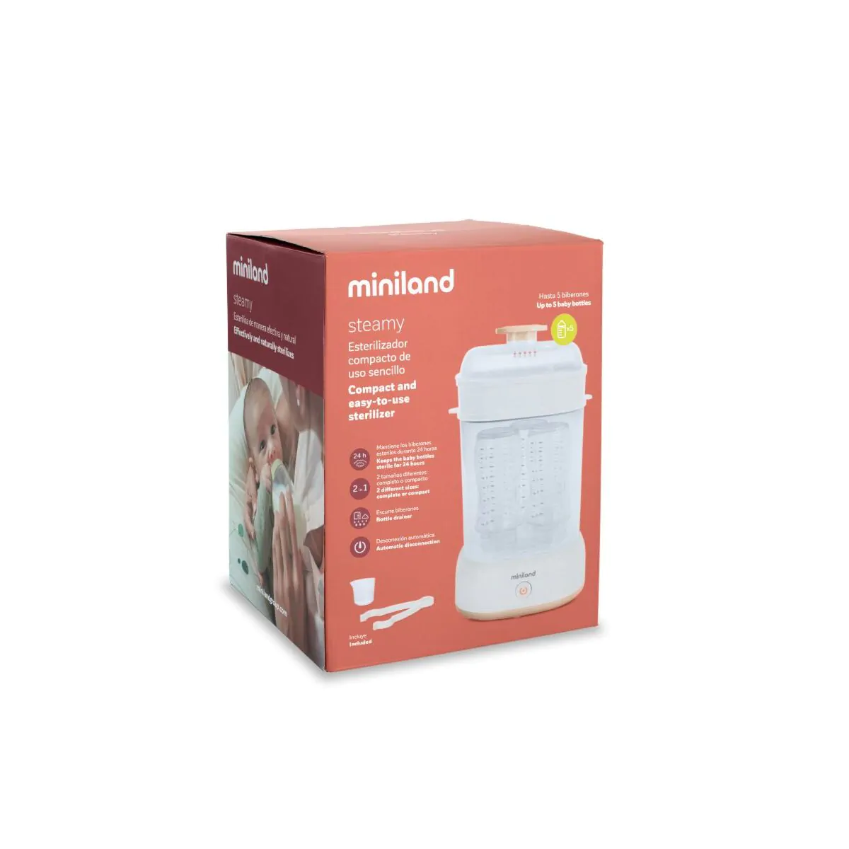Le stérilisateur électrique Steamy de Miniland stérilise jusqu’à 6 biberons et accessoires en seulement 6 minutes grâce à la vapeur, sans produits chimiques. Il offre une grande capacité, un affichage du temps restant, et maintient la stérilisation pendant trois heures. Pratique à ranger, facile à nettoyer, avec des alertes visuelles et sonores pour une sécurité maximale.