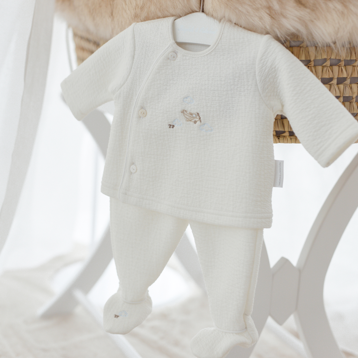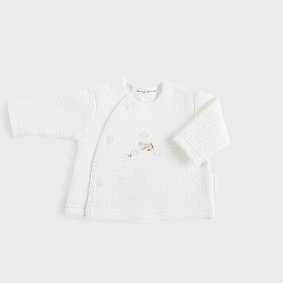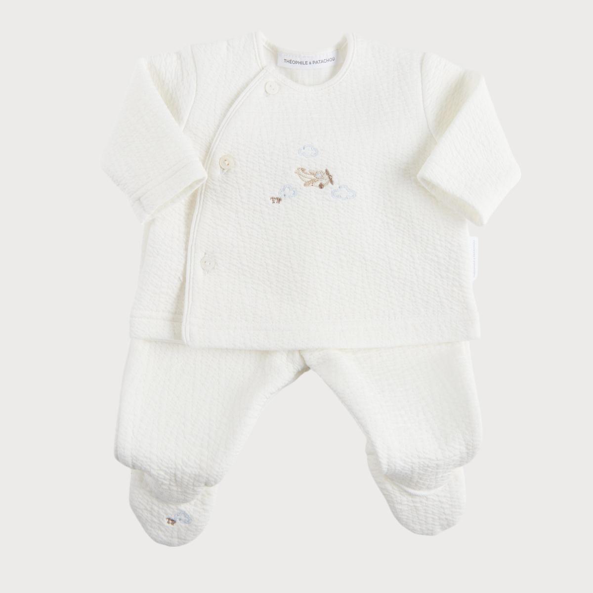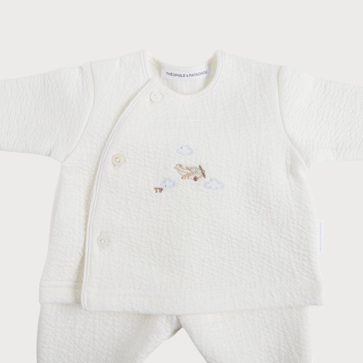Créer une listeBrassière ivoire en jersey gaufré ornée d’une délicate broderie avion et sa culotte botte. Habillez votre enfant en toute élégance avec Théophile & Patachou.